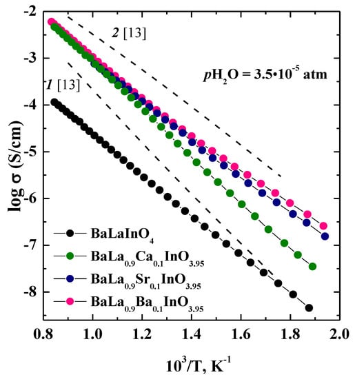 - Ishihara, T.; Yan, Y.; Sakai, T.; Ida, S. Oxide ion conductivity in doped NdBaInO4. Solid State Ion. 2016, 288, 262–265. [Google Scholar] [CrossRef]