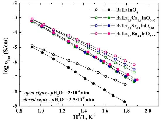 - Fujii, K.; Shiraiwa, M.; Esaki, Y. Improved oxide-ion conductivity of NdBaInO4 by Sr doping. J. Mater. Chem. A 2015, 3, 11985–11990. [Google Scholar] [CrossRef]