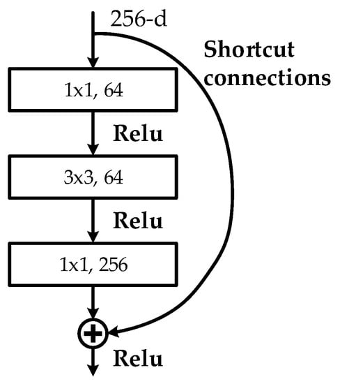FEN is a large CNN that can automatically extract high-level features from input images. In this study, we used ResNet101 [27] to obtain high-level and semantically strong features. The basic structure of the ResNet101 is a bottleneck which solves the network performance degradation problem and leads the CNN model deeper than ever. As depicted in Figure 5, the bottleneck contains three convolutional layers: 1 × 1, 3 × 3, and 1 × 1 convolutional layers, which is followed by a “Relu” activation function [28], respectively, and “shortcut connections,” which are those skipping one or more layers and map input directly to output without adding extra parameters.