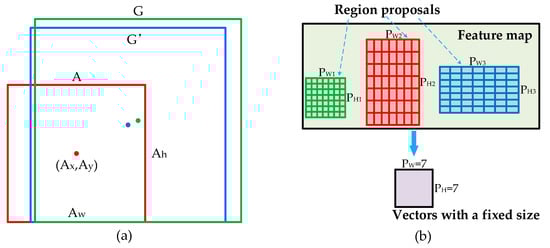 The region proposals output from the improved RPN have different dimensions, and the input of final classification and regression layer need to be the same size, so the purpose of ROI pooling is to perform max pooling to convert the features inside any proposals into vectors with a fixed size (e.g., 7 × 7). The specific operation of ROI pooling is shown in Figure 9b. Firstly, the region proposals with different sizes are divided into equal-sized sections, such as 7 × 7; then, the max value in each section is output, and fixed-size vectors can be obtained.