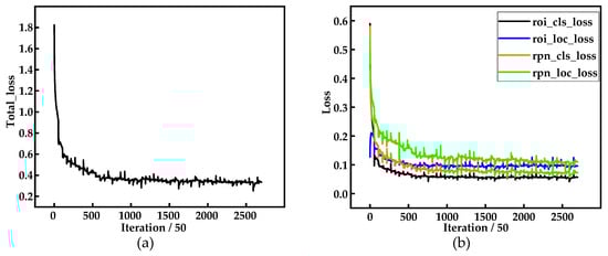 (a) The total_loss curve during the process of network training; and (b) the roi_cls_loss, roi_loc_loss, rpn_cls_loss, and rpn_loc_loss curves during the training.