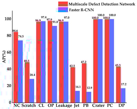 The APs for ten types of defects of the Faster R-CNN and multiscale defect-detection network are shown in Figure 11. For Corner Leak (CL), Orange Peel (OP), Leakage, Crater, and Parti-Color (PC), both networks achieved high APs, nearly at 100%. For Paint Bubble (PB) and Dirty Point (DP), the scales of which were small, APs of the multiscale defect-detection network was greatly higher than Faster R-CNN, which illustrates the improvement of the network in the detection of small size defects. As can be seen in Table 2 and Figure 11, the mAP of the multiscale defect-detection network and the APs for several types of defects were still low, so there were many defects that were not detected. These missed detections may have been caused by the small training dataset. Therefore, in future studies, a larger dataset in each category will be generated to improve the network’s detection capacity.