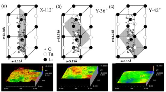 A LiTaO3 single crystal belongs to the trigonal R3c space group with an ion bonding structure and is commonly depicted by a hexagonal axes. Figure 1 shows a schematic illustration of the atomic arrangement in a LiTaO3 single crystal and the typical orientations (), () and () i.e., X-112°, Y-36° and Y-42° are displayed in Figure 1a–c, respectively. The Li atom lies in an oxygen layer that is c/4 away from the Ta atom, and the Ta atom is centered between the oxygen layers. The representative surface morphologies of three planes are also exhibited in Figure 1 below the lattice diagrams. The surface roughness Ra was 1.58 nm, 1.50 nm and 2.18 nm on the area of 360 μm × 270 μm for the X-112°, Y-36° and Y-42° planes, respectively.