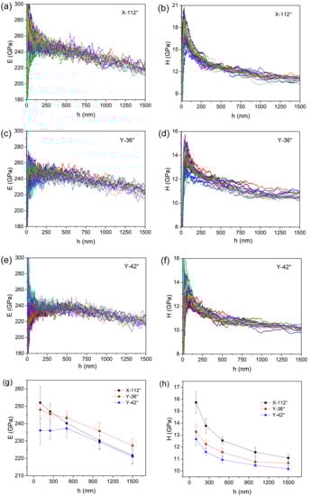 Figure 2 shows the elastic modulus E and hardness H as a function of pressed depth for three planes, in which eighteen tests were repeated in each case. The experimental results exhibited good reliability once the pressed depth was beyond about 100 nm. The disparities of the elastic modulus and hardness at a very shallow depth were mainly due to tip imperfections. Clearly, from the indentation size effect (ISE), it appeared that both E and H gradually decreased with increasing nanoindentation depth. The values of E and H at 100 nm, 250 nm, 500 nm, 1000 nm and 1500 nm are persented in Figure 2g,h. Obviously, ISE was more pronounced in the X-112° plane than the other planes. The mean value of E and H decreased from 252 GPa to 222 GPa and 15.7 GPa to 11.1 GPa for the X-112° plane, as the pressed depth increased from 100 nm to 1500 nm. The total range of E and H was about 248 GPa to 227 GPa and 13.3 GPa to 10.6 GPa for the Y-36° plane, 236 GPa to 221 GPa and 12.6 GPa to 10.2 GPa for the Y-42° plane, respectively. The X-112° plane exhibited the strongest resistance to plastic deformation, i.e., the highest hardness. The Y-42° plane was the weakest orientation in a single crystal of LiTaO3. It is worth mentioning that the H and E in LiTaO3 were comparable with He et al.’s result using the Berkovich indenter [] and higher than Anasori et al.’s result using spherical tips [].