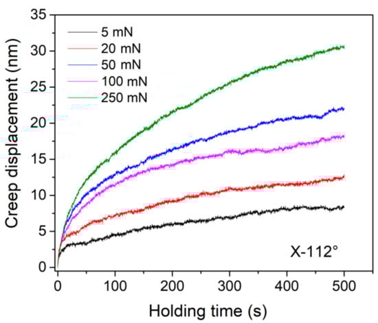 Figure 4 shows the corresponding creep displacement during the holding stage at various peak loads for the X-112° plane, as an illustration. For a clear view, the onsets of creep flows were set to be zero in both time (X-axis) and displacement (Y-axis). Notwithstanding the holding time was quite limited, creep deformation was observed at room temperature in a LiTaO3 crystal, of which the melting point reached 1250 °C. This result could be mainly due to the great holding strain, which was estimated as 7.1% beneath the Berkovich indenter. Before the holding stage, severe plastic deformation had already occurred and the holding strain was far beyond the elastic limit, i.e., over-yielding holding. According to the creep feature in the conventional holding method, high stress and/or holding strain effectively promote the creep deformation. To be different from the conventional creep curves, only the first two stages (i.e., transient stage and steady-state stage) could be observed in nanoindentation creep flow. At the transient stage, creep displacement was precipitously increased in a short time while the creep rate dropped fast. Qualitatively, the duration of the transient stage was enlarged with an increasing holding load. At the steady-state stage, creep displacement almost linearly increased with holding time. In addition, the slope of the steady-state creep curve (i.e., the creep rate) gradually increased with the holding load. It should be noted that the creep deformation could be regarded as homogeneous and that no abrupt jump of displacement was detected during creep flow [].