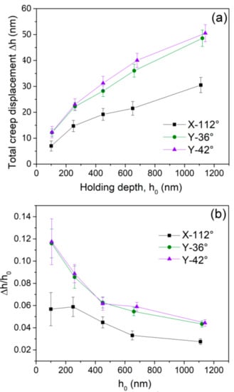 The total creep displacements at the end of the holding stage, at various peak loads, were recorded for the three planes, as exhibited in Figure 5a. For self-similar Berkovich nanoindentation, the deformation region was in direct proportion to the pressed depth and the deformation strain was constant. Provided that creep resistance of a LiTaO3 crystal was size-independent, higher values of creep displacement were expected under larger holding loads. Evidently, the X-112° plane had the strongest creep resistance in the three orientations. Creep deformations in the Y-36° and Y-42° planes were similar and occurred relatively easily. The orientation effect on creep deformation perfectly conformed to the hardness features of the three planes in Figure 2h. As it was aforementioned that holding region beneath indenter plays an important role in creep displacement, creep strain could be adopted to study the nanoindentation size effect on creep behaviors of a LiTaO3 crystal. Here we defined creep strain as the total creep displacement versus the initial holding depth Δh/h0. As it isshown in Figure 5b, creep strains at various holding depths were estimated for the three planes.