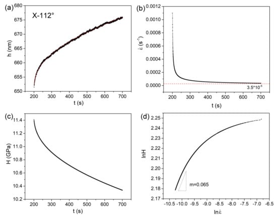 The present creep feature under nanoindentation was close to conventional creep behavior. Hence it has merits to estimate the strain rate sensitivity (SRS) [,] in order to reveal the creep mechanisms of three planes and their correlation with nanoindentation length scale. Here we selected a 100 mN-holding test in the X-112° plane, as an illustration, to calculate SRS. As shown in Figure 6a, the creep curve was perfectly fitted (R2 > 0.99) by an empirical law []: