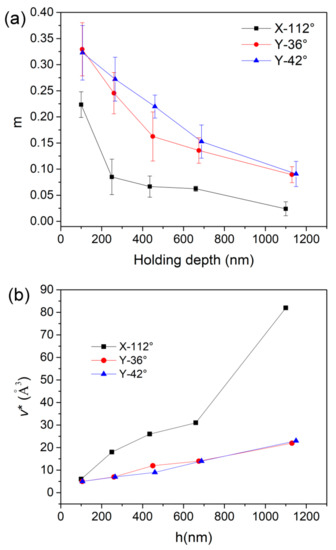 The values of SRS at various holding depths were all computed for the three planes, as summarized in Table 1. As the holding depth increased from about 100 nm to 1100 nm, m decreased from 0.33 to 0.09 for the Y-36° and Y-42° planes, and 0.22 to 0.024 for the X-112° plane. The nanoindentation size effect on SRS could be more clearly recognized from the correlation between m and holding depth in Figure 7a. Such reduction of m on the holding depth has been reported in crystalline and amorphous solids [,,]. In previous work, m decreased at an initial shallow depth and quickly tended to be stable once the pressed depth was beyond 100nm in alloys. In the present work, the reduction tendency of m was observed throughout a wide range from 100nm to 1100nm. In comparison, the values of SRS in the Y-36° and Y-42° planes were very close and evidently larger than the X-112° plane. The value of SRS m or stress exponent n (n = 1/m) was widely used as an indication of the creep mechanism at a high temperature []. For crystalline alloys or metals, dislocation move is dominating in creep flow as m falls in the range of 0.1 to 0.3. The detected values of m (0.33–0.09) in the Y-36° and Y-42° planes were comparable to the result by conventional creep testing under a high temperature and thousands of hours. This could explain that high stress and plastic deformation under nanoindentation dually stimulate the creep flow, equivalent to the thermal effect on atomic motion. For plastic holding, both stress level and atomic surroundings beneath indenter could meet the requirement of dislocation activation. While for the X-112° plane, the low m at deep nanoindentation could be due to unexpected obstructions for dislocation move. In addition, the low m in the magnitude of 10-2 has been revealed in nanoindentation creep of a nano-crystalline film, which was several times lower than that in conventional high-temperature creep [].