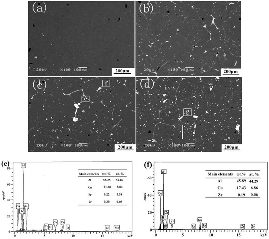 SEM images of T5 heat-treated alloys with different Er content: (a) 0; (b) 0.1 wt %; (c) 0.3 wt %; (d) 0.5 wt %; (e,f,g) EDS images of T5 heat-treated alloys with 0.3 wt % Er content; (h) XRD spectrum of T5 heat-treated alloys with 0.3 wt % Er content.