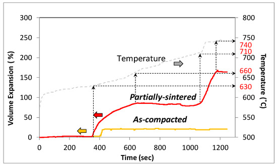 The traditional PM technique of aluminum foam production entails, firstly, the fabrication of high-green-density compacts from the metallic powder and blowing agent mixture via warm pressing (~350 °C) [32,42]. This step is generally followed by heating of the compacts to the metallic matrix melting point and blowing agent decomposition temperature (foaming step). However, it was reported that the warm pressing of the powders at such low temperatures is insufficient for achieving uniform cellular structures [43,44]. As a result, additional treatments such as double-axial compaction [45], extrusion, etc. are employed prior to foaming. It was stated that extrusion breaks the tenacious oxide films encasing the metallic powders, creating improved inter-particle bonding. This in turn results in a more uniform microstructure in the final foam. In the present study, rather than using extrusion as an intermediate step, we opted for application of heat alone in the absence of pressure. This relatively low-cost intermediate step, referred to as “partial sintering” is in essence a heat treatment of the compacted precursors to 450 °C for different dwell times. The idea is to promote sufficient inter-particle bonding in the compacts to efficiently encapsulate the released gas and, consequently, to produce highly expanded, homogeneous cellular structures.