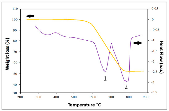 Thermogravimetric analysis (TGA)–differential scanning calorimetry (DSC) curves of dolomite decomposition and weight loss between 200 and 900 °C.