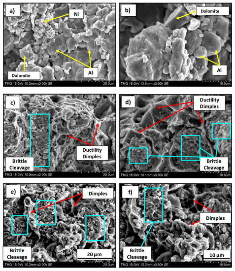 As seen in Figure 3a,b, the fracture surfaces of the as-compacted specimens showed a high degree of particle packing, consistent with their high green density. However, no bonding or interconnectivity was observed between the constituent particles (Al, Ni, and dolomite), which remained constrained within the original boundaries. Alternately, the partially sintered compacts for 15-min and 20-min dwell times (Figure 3c–f) exhibited clear inter-particle bonding. The partially sintered (I and II) specimens showed a combination of ductile dimples and brittle regions. EDS analysis (not presented here) revealed that ductility dimples were aluminum-rich areas, whereas brittle cleavage zones corresponded with the Al3Ni phase. The occurrence of dimples in the aluminum matrix and the intergranular fracture mode of the brittle phase confirm the surface diffusion associated with the initial stage of sintering. However, the absence of well-defined particulate borders in these fracture surfaces and the development of the intermetallic phase suggest more a bulk transport mechanism, such as grain boundary diffusion and volume diffusion, consistent with an intermediate sintering stage. Nonetheless, it is evident from the fractographs of the partially sintered I and II precursors that the network of pores, initially interconnected, which were channels for CO2 escape in the as-compacted samples, became disrupted and possibly isolated by neck formation and intermetallic phase development during heat treatment.
