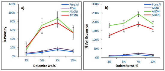 Porosity levels (a) and volume expansion (b) of foams containing 0 wt.% Ni (pure Al), 5 wt.% Ni (Al–5Ni), 10 wt.% Ni (Al–10Ni), and 15 wt.% Ni (Al–15Ni) as a function of dolomite content.