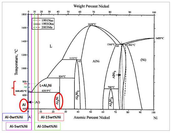 Al–Ni phase diagram showing the Ni additions—adapted from Reference [40].