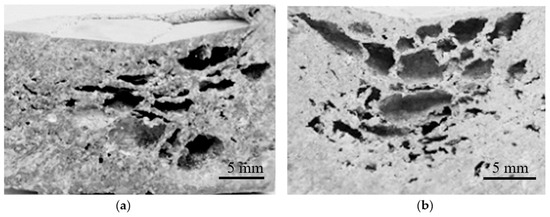 Nevertheless, at the same melt viscosity, an increase in foaming agent to 10 wt.% (Al–10Ni) resulted in coalescence of the pores (Figure 7b). The melt was unable to accommodate the higher gas release rate, which consequently triggered rupture of isolated cell walls. For compositions containing 15 wt.% Ni (Al–15Ni), the calculated percentage of solid in the melt at 650 °C was approximately 25% (i.e., 2.5 times higher than in Al–10Ni) and, at 710 °C, was about 15%. This high amount of solid phase in the melt is believed to have excessively raised the melt viscosity, hindering the appropriate foam morphology development. Figure 8a,b depict the macrostructures of Al–15Ni foams, containing 5 wt.% and 7 wt.% foaming agent, respectively.