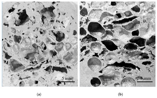 Macrostructures of Al–15Ni foams with 5 wt.% (a) and 7 wt.% (b) dolomite additions.
