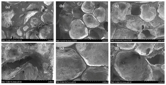It was noted that, for this combination of additives, the matrix allowed the development of well-formed spherical pores defined by a smooth interior surface (Figure 9e) and absence of defects. Therefore, the foam obtained from partially sintered precursors containing 10 wt.% Ni (Al–10Ni) and 7 wt.% dolomite exhibited an optimum combination of foam porosity, volume expansion, and cell structure homogeneity.