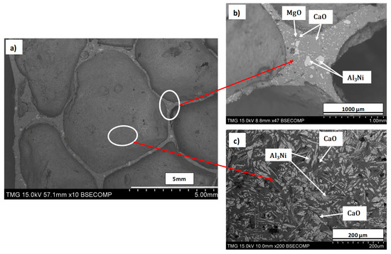 The second and third stabilization contributions are expected from in situ formed particles during dolomite decomposition (foaming stage) and intermetallic phase development (heat treatment and foam solidification), respectively. In order to evaluate whether these mechanisms are in effect, further analyses were performed. Figure 11 shows the XRD pattern of Al–10Ni with 7 wt.% dolomite in the as-compacted (a), partially sintered precursors (b), and final foams (c). Figure 12 depicts the compositional micrographs of the cellular material obtained (a), identification by EDS, along with characteristic features of the plateau border zones (b), and internal cell surface (c). As observed in Figure 11a, the as-compacted specimens exhibited a combination of Al, Ni, and dolomite. With the heat treatment process (Figure 11b), it is observed that the Al3Ni intermetallic phase started to form in the partially sintered precursors. These findings are in agreement with the EDS intermetallic identification in the fracture surface of the partially sintered specimens (Figure 3c,d). The final cellular material (Figure 11c) shows the reflections of the Al matrix, the two oxides (MgO and CaO) resulting from dolomite decomposition, and the Al3Ni intermetallic phase. Previous studies [32] showed that, in carbonate-based Al foams, a reaction occurs between molten Al and the CO2 gas, which leads to a continuous aluminum oxide film on the internal cell surface.
