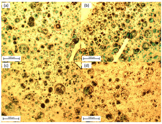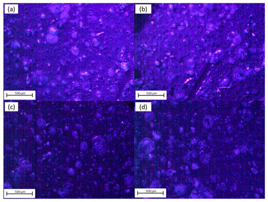 Figure 3 shows four different region micrographs at 40× magnitude to unveil the surface changes along the sample. The presented regions were selected randomly to visualize film homogeneity. First, the surface showed dark and light regions. Rounded clusters were observed, mostly dark colored, embedded in the lighter region with different cluster sizes (24.3–361.5 μm). For the first two regions, most clusters presented a green color as the inner ring and some fully colored. For the next region, a lighter green color was observed in a few clusters, and for the last region only a few large clusters were light green colored. Surface roughness varied along the film, and clusters were subject to have darker areas than that of the lighter surface because of the increased thickness and the possible increase in the concentration of the deposited InClPc. Also, the green color was attributed to the InClPc, which indicated that the deposition process generated InClPc clusters, and the clusters increased further in size with the time of deposition and following thermal annealing. Nevertheless, different film homogeneity and equal cluster density were observed among the different regions, but each region had good film uniformity. Also, the clusters sizes varied for the different regions, as observed in