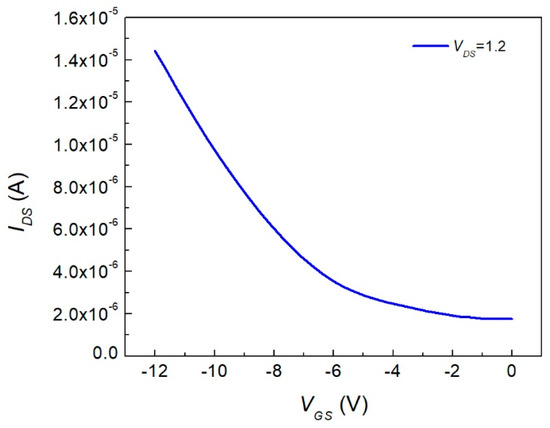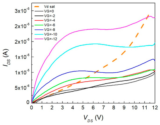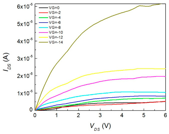 VGS was −14 V, the device presented a current on the order of dozens of microamperes, which increased by one order of magnitude. Also, as seen in the curve, the device started to work when