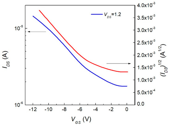 Figure 9, the OFET device current–voltage characteristics are depicted. The threshold voltage was obtained from the linear extrapolation intercept with the abscissa axis. The section had a threshold voltage value of 0.59 V. Therefore,