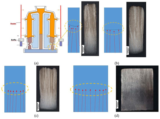 Metallographic photos of longitudinal sections of starters with different widths: (a) 8 mm, (b) 10 mm, (c) 15 mm, and (d) 30 mm.