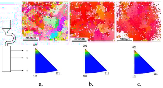 Diagrams and inverse pole figure at different heights with width 10 mm. (a) Height 2 mm; (b) Height 15 mm; and (c) Height 25 mm.