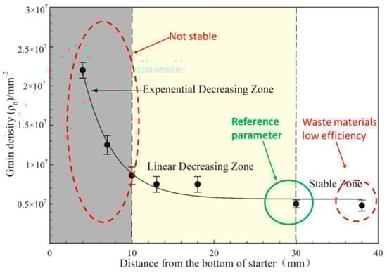 As shown in Figure 6, the number of grains in the range of 0–10 mm from the bottom is drastically reduced, and the rate of reduction from 10 mm to 30 mm is significantly slowed. Above 30mm, the number of grains remains stable.