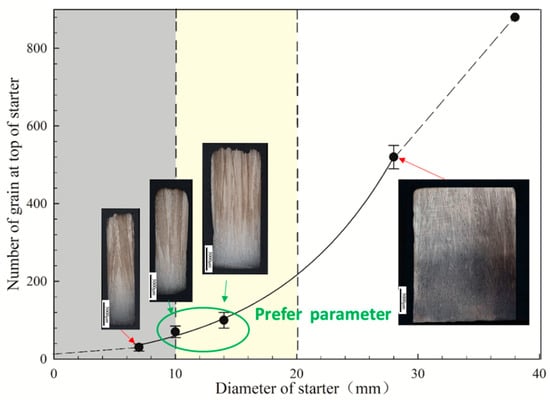 In this study, the effect of the diameter of the starter block on grain selection was investigated by experimental research on starter blocks of different diameters. Table 2 lists the designed diameters of the starter block.