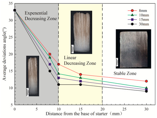 Figure 4 shows the longitudinal sections of four starter blocks. In all starter blocks, at the water-cooled chill area, the <001> orientations are randomly distributed and the number of grains is extremely large. The equiaxed grains at the bottom grow to form a column grains as the height increases. Meanwhile, the grains with large deviations are eliminated. Finally, only a small amount of grains with small deviation angles remain at the exit of the starter block. Figure 4 shows that with solidification, grains deviating from the <001> orientation are eliminated and the average orientation deviation becomes smaller and approaches 5°. The effect of height becomes insignificant after a 30 mm height is reached.