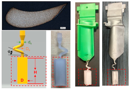 As shown in Figure 9, the optimized parameters of the starter block with a width of 10mm and a height of 30 mm was applied in a SX turbine blade casting with Mar M247LC. The grain selector was printed and the key geometry parameters were as listed below: