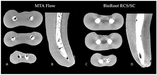 - Sisli, S.N.; Ozbas, H. Comparative micro–computed tomographic evaluation of the sealing quality of ProRoot MTA and MTA Angelus apical plugs placed with various techniques. J. Endod. 2017, 43, 147–151. [Google Scholar] [CrossRef] [PubMed]