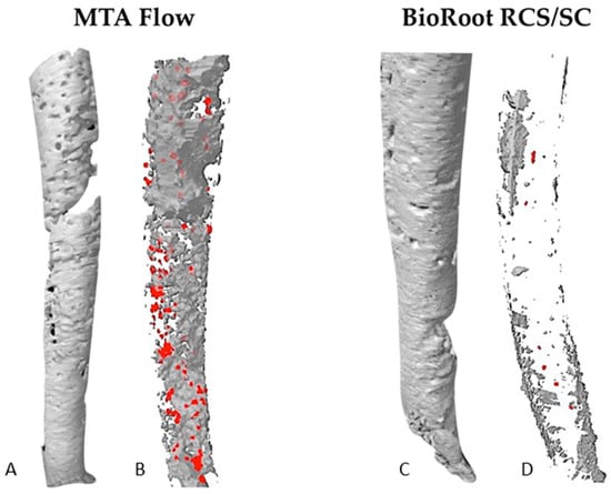 The µCT evaluation revealed pores of various sizes inside the filling materials as well as in the interface of the fillings and root canal walls in both groups (Figure 1).