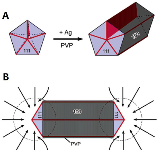 Growth mechanism of silver nanowires (AgNWs) with pentagonal cross sections: (A) evolution of a nanorod from a multiply twinned nanoparticles (MTPs) of silver and (B) diffusion of silver atoms toward the two ends of a nanorod, with the side surfaces completely passivated by polyvinylpyrrolidone (PVP) [38].