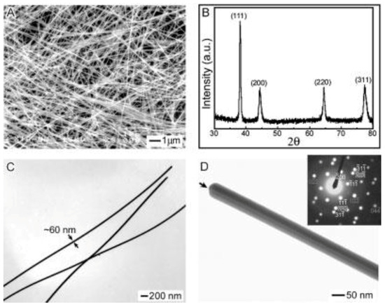 (A) Scanning electron microscopy (SEM) and (C) transmission electron microscopy (TEM) image of homogeneous AgNWs prepared using polyol method, (B) X-ray diffraction (XRD) pattern indicating face centered cubic (fcc) structure, and (D) TEM image showing the twin plane of single AgNWs and microdiffraction pattern (inset) [43].