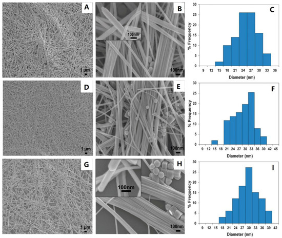Field-emission scanning electron microscope (FESEM) images of copper nanowires (CuNWs) prepared using (A,B) hexadecylamine (HDA), (D,E) octadecylamine (ODA), and (G,H) oleylamine (OLA). The diameter distributions of the corresponding CuNWs prepared by using HDA, ODA, and OLA are shown in (C), (F), and (I), respectively. The insets in (B) and (H) show side views of the nanowires with pentagonal ends [60].