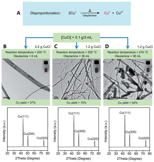 (A) Reaction for generating CuNWs. (B–D) Yield, morphology, and XRD pattern of CuNWs prepared at different conditions. Insets show the reddish CuNWs products after purification [14].