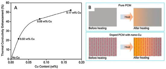 (A) Thermal conductivity enhancement of phase change material (PCM) (B). Schematic diagrams of heat transfer and dissipation in the pure PCM versus CuNW-doped PCM upon heating [14].