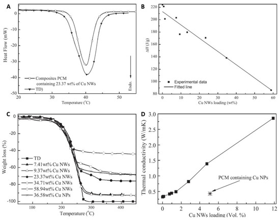 (A) differential scanning calorimetry (DSC) curves, (B) phase change enthalpy (ΔH) with different loadings of CuNWs, and (C) thermogravimetry (TG) curves of tetradecanol (TD) and the composite PCMs. (D) Thermal conductivity of the composite PCMs [64].