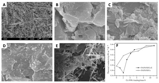SEM images of (A) CuNWs, (B) palmitic acid (PA)/polyaniline (PANI)-2, and (C) PA/PANI-2 was washed with ethanol three times. (D) PA/PANI/Cu-E-6 and (E) PA/PANI/Cu-5 (F) thermal conductivity of the form-stable PCMs doped with CuNWs [77].
