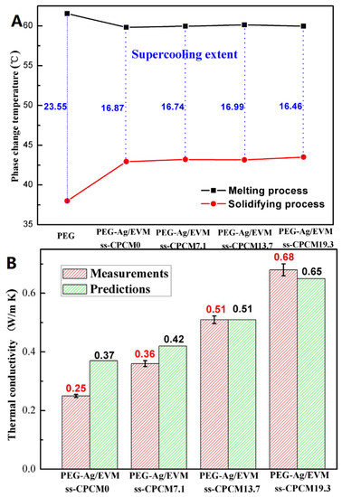(A) Supercooling degrees of PEG and PEG-Ag/EVM ss-CPCMs with different concentration of AgNWs and (B) measured and predicted thermal conductivities of PEG-Ag/EVM ss-CPCMs at 20 °C [79].