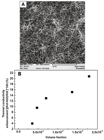 Carbajal–Valdez et al. [80] prepared AgNWs via polyol method. SEM imaging (Figure 15A) clearly shows that the uniform AgNWs had a length of up to 10 µm with a mean diameter of 96.04 nm. The AgNWs with different volume fractions were then dispersed into distilled water to form a nanofluid. It was pointed out that the AgNWs showed an effective thermal transport property at low loadings. For example, by adding 1.74 × 10−4 vol.% of AgNWs, an enhancement of 20.8% in thermal conductivity was achieved (Figure 15B).