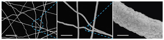 SEM image of AgNW network (scale bar 10 and 2 µm and 300 nm) [87].