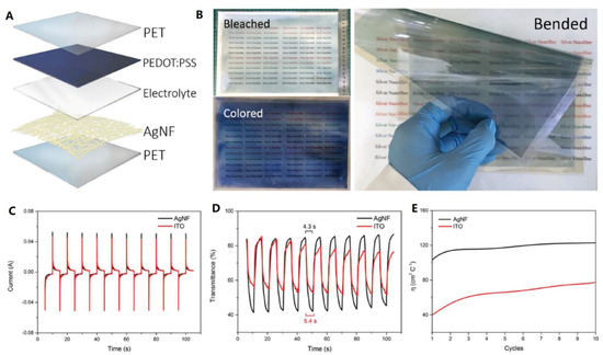 (A) structural schematic of AgNW-based electrochromic window (ECW), (B) flexible A4-sized ECW, (C) current response, (D) transmittance response, and (E) coloration efficiency during the first 10 switching cycles [87].