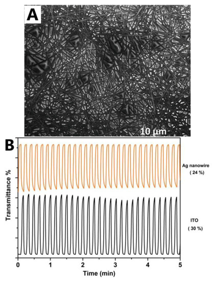 Yuksel et al. [91] prepared a AgNW/polymer (P1C)-based ECD as a blue transmissive switching material. The P1C showed a very fast switching response of 0.86 s for tinting and 0.57 s for bleaching. An AgNWs with a high aspect ratio was used as the transparent contact for the P1C layer. SEM imaging shows that the AgNW network was uniformly covered with the P1C, forming a nanocomposite TCE (Figure 20A). A good optical contrast of 24% was demonstrated for the AgNW/P1C-based ECD compared to the ITO/P1C ECD of 30%, as shown in Figure 20B.