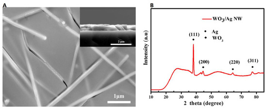 (A) SEM image of the AgNW electrode coated with WO3 film and the cross-section of the WO3/AgNW (inset) and (B) XRD pattern of the WO3/AgNW film [92].