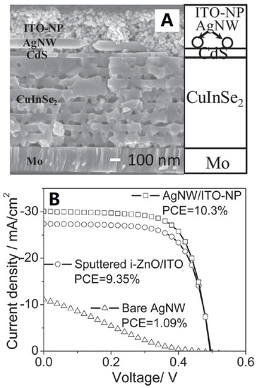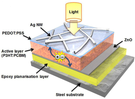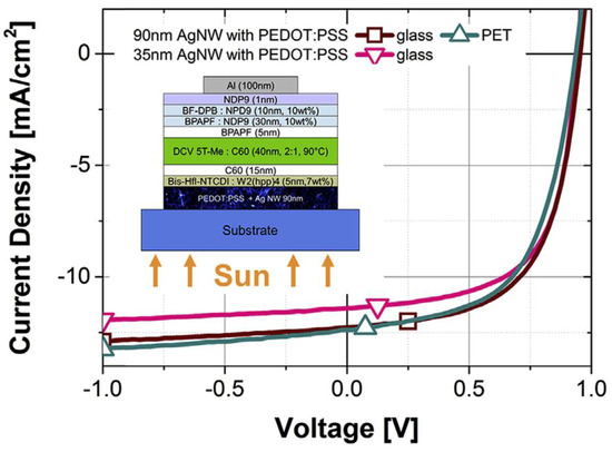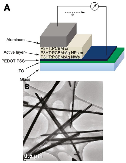 - Kim, C.-H.; Cha, S.-H.; Kim, S.C.; Song, M.; Lee, J.; Shin, W.S.; Moon, S.-J.; Bahng, J.H.; Kotov, N.A.; Jin, S.-H. Silver Nanowire Embedded in P3HT:PCBM for High-Efficiency Hybrid Photovoltaic Device Applications. ACS Nano 2011, 5, 3319–3325. [Google Scholar] [CrossRef] [PubMed]