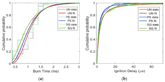 Cumulative probability of: (a) burn time and (b) ignition delay for untreated Al powder (UN Al), pre-stressed Al powder (PS Al) and super-quenched Al powder (SQ Al).