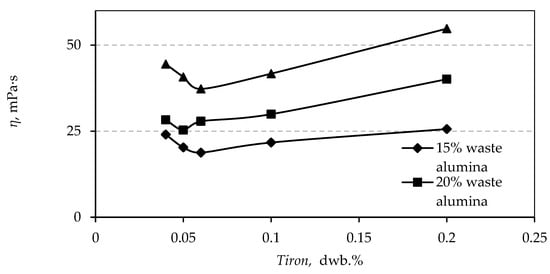 Apparent viscosity of alumina 70 wt.% suspensions with three different amounts of waste alumina powder as a function of Tiron concentration (dwb.%).