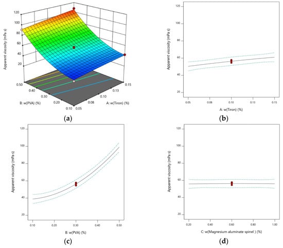 The effect on apparent viscosity of 70 wt.% Al2O3 suspensions which contain 20 dwb.% waste Al2O3 powder: (a) 3D-plot of viscosity on two factors (PVA content and Tiron content); (b) Tiron; (c) poly (vinyl alcohol) (PVA); (d) magnesium aluminate spinel (MgAl2O4).